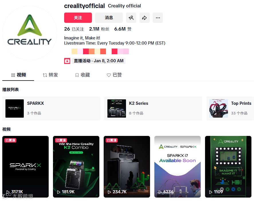 3D打印机单价高达数百美元,传统短视频难以解决操作复杂、耗材选择等专业疑问。创想三维通过垂直达人合作+深度直播答疑的方式破局。